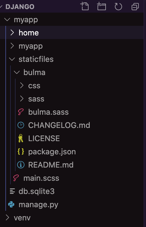 You’ll notice a new node_modules folder got generated. Inside that one is another folder called bulma. Copy the bulma folder into the root of your staticfiles folder and delete node_modules.